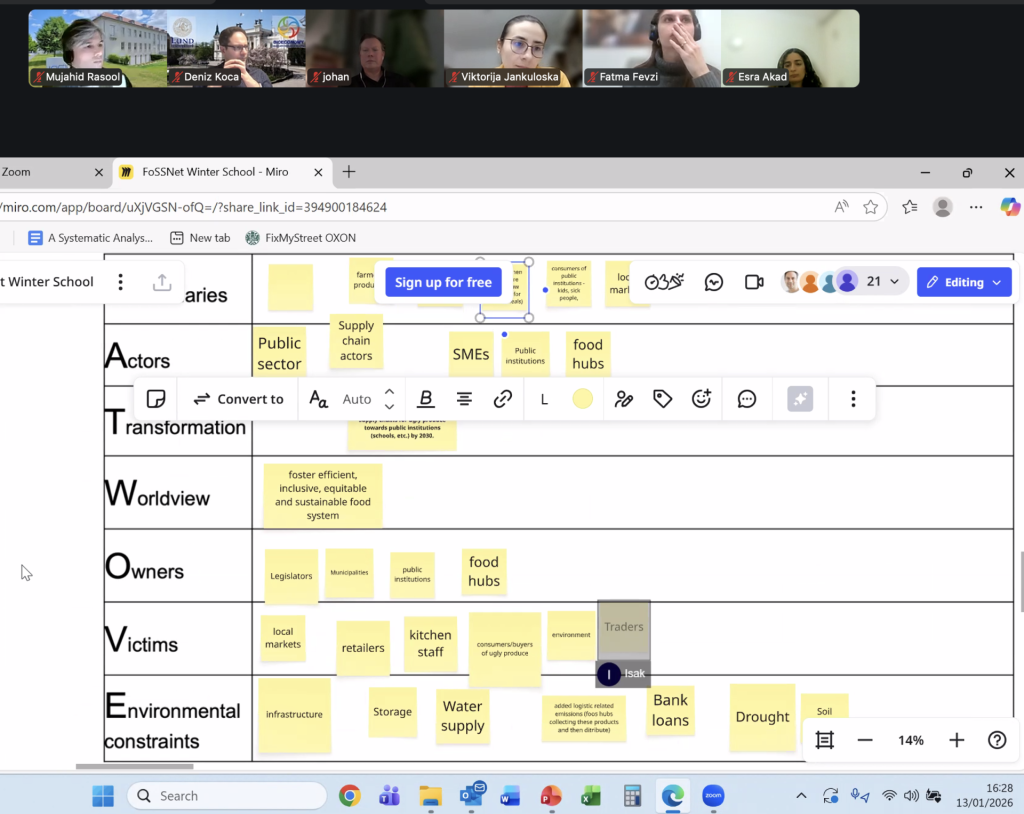 Below pictures taken from the online sessions of the Winter School which show some of the content and methodologies applied including Miro board for group exercise and the BATWOVE exercise. BATWOVE is a core element of Soft Systems Methodology (SSM), used to structure systems thinking about a desired future state or transformation.