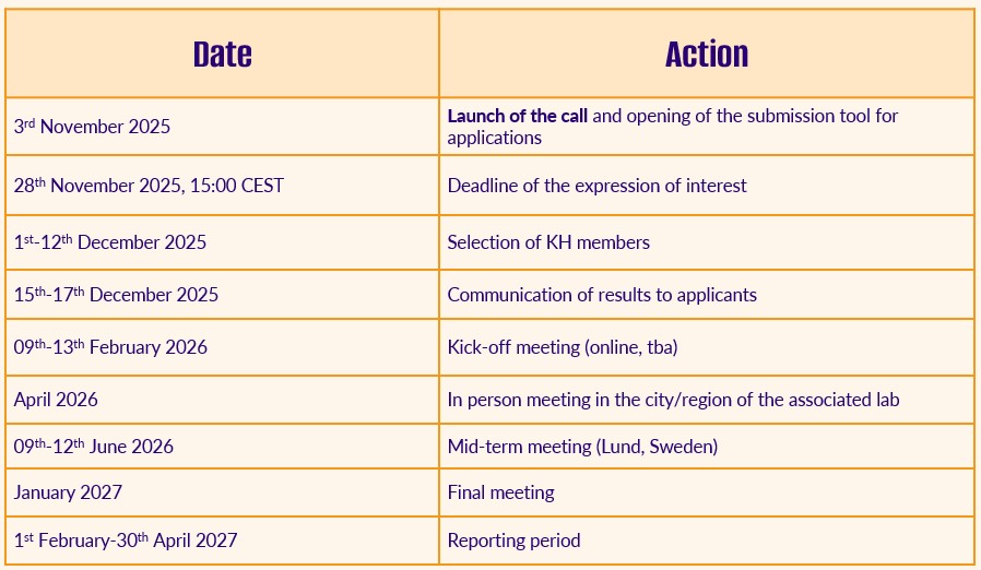 The KH will be active for a period of 15 months, divided to 12 months of research work lasting from February 2026 until January 2027, followed by a three-month reporting period.